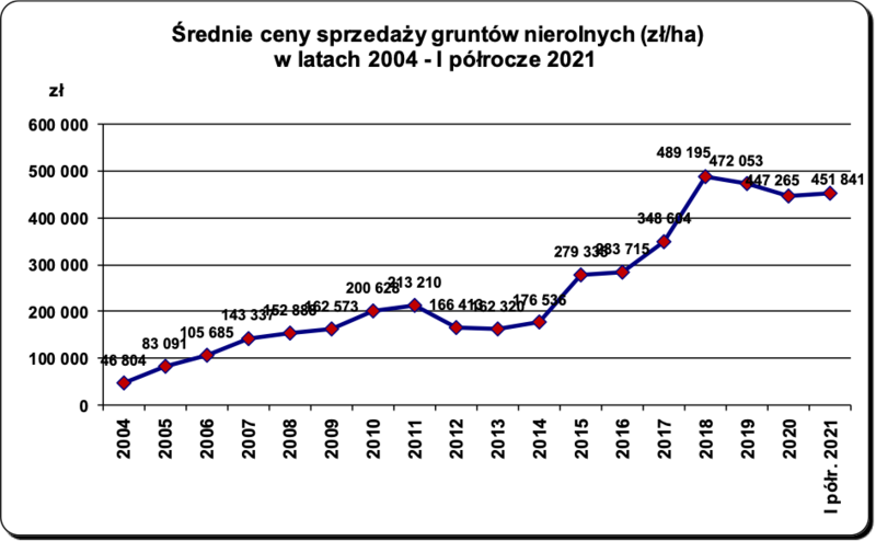 Od czterech lat Krajowy Ośrodek Wsparcia Rolnictwa odnotowuje rokrocznie sprzedaż nieruchomości nierolnych na zbliżonym poziomie od 600 do 800 ha. Roczne kwoty ze sprzedaży terenów inwestycyjnych to ok. 250–400 mln zł. W I półroczu 2021 r. KOWR sprzedał 646,5 ha gruntów nierolnych za kwotę 292,1 mln zł. W tym celu zawarł 1141 transakcji. Średnia cena sprzedaży 1 ha gruntów nierolnych wyniosła 451,8 tys. zł.