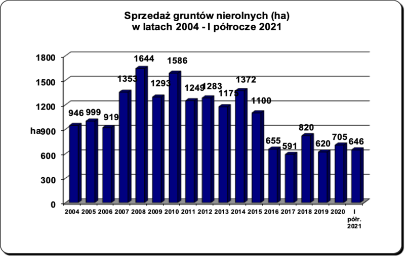 Najwięcej gruntów nierolnych w I półroczu 2021 r. sprzedano w OT w Olsztynie – 152 ha, w OT w Gorzowie – 114 ha, w OT w Opolu – 93 ha i w OT w Pruszczu Gdańskim – 66 ha (razem 425 ha – 66% sprzedanych gruntów nierolnych ogółem).