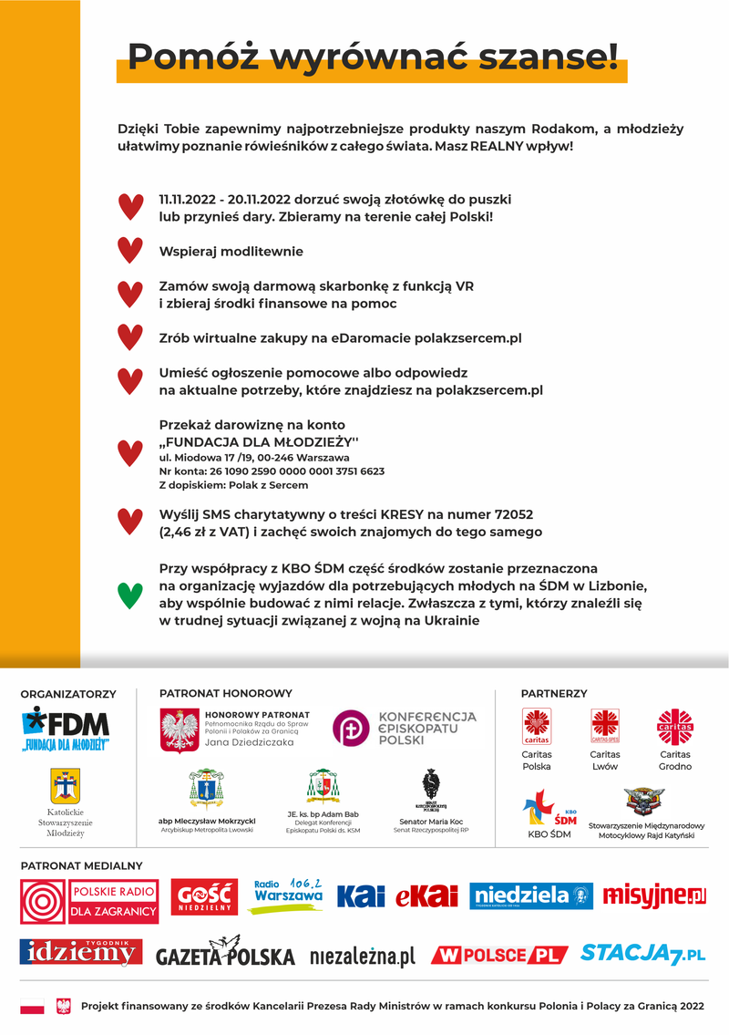 Akcja, która zrodziła się w 100 lecie odzyskania niepodległości trwa i się rozwija. Łączy Polskie serca i uczy wrażliwości. 11 listopada wystartowała piąta edycja akcji charytatywnej "Polak z sercem” organizowanej przez Katolickie Stowarzyszenie Młodzieży i FUNDACJĘ DLA MŁODZIEŻY. To okazja, aby wesprzeć potrzebujących rodaków mieszkających na Kresach, którzy żyją w warunkach ubóstwa. Uzyskane wsparcie popłynie na Ukrainę, Białoruś i Litwę.