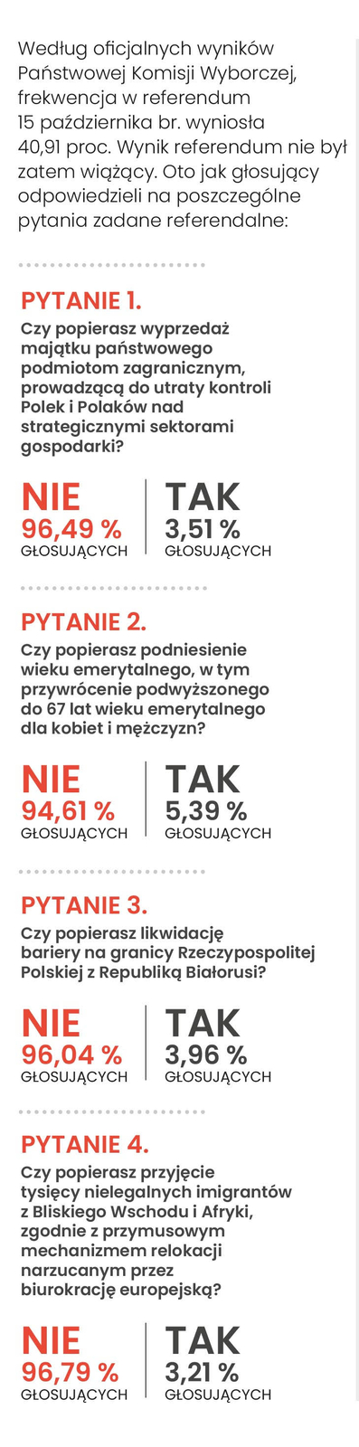 Referendum połączone z wyborami parlamentarnymi było najbardziej krytykowane po 1989 roku. Partia rządząca zadała cztery pytania: o wiek emerytalny, wyprzedaż majątku państwowego, relokację imigrantów i zaporę na granicy z Białorusią. Zdecydowana większość zagłosowała cztery razy „nie", co powinno stanowić istotny sygnał dla przyszłej władzy – nawet jeśli nie osiągnięto progu ponad 50 proc. w głosowaniu. Nie można lekceważyć głosu ponad 12 mln polskich obywateli. Biorąc pod uwagę, że na PiS głosowało około 7,6 mln uprawnionych, to 15 października odpowiedzi na cztery pytania udzielili również wyborcy innych partii.