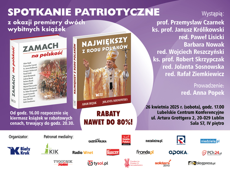 Wydawnictwo Biały Kruk zaprasza na spotkanie patriotyczne w Lublinie, w sobotę 26 kwietnia, w zjednoczeniu na modlitwie o życie wieczne dla zmarłego Ojca Świętego Franciszka oraz w trosce o znów niszczoną i atakowaną Polskę.